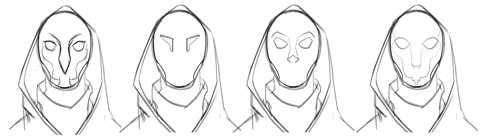 Nevertheless, I tried my best to look for references and learnt bits and pieces of anatomy whenever I can. However, I made sure not to stray far away from the mood boards and to stay true to the visual style I've created for the game thus far. I experimented with different head designs: with and without hoods, different robe looks and looked at mage designs from various artists to understand how I should approach designing my character. The following compilation is organised chronologically, from the earlier drawings to the latest.